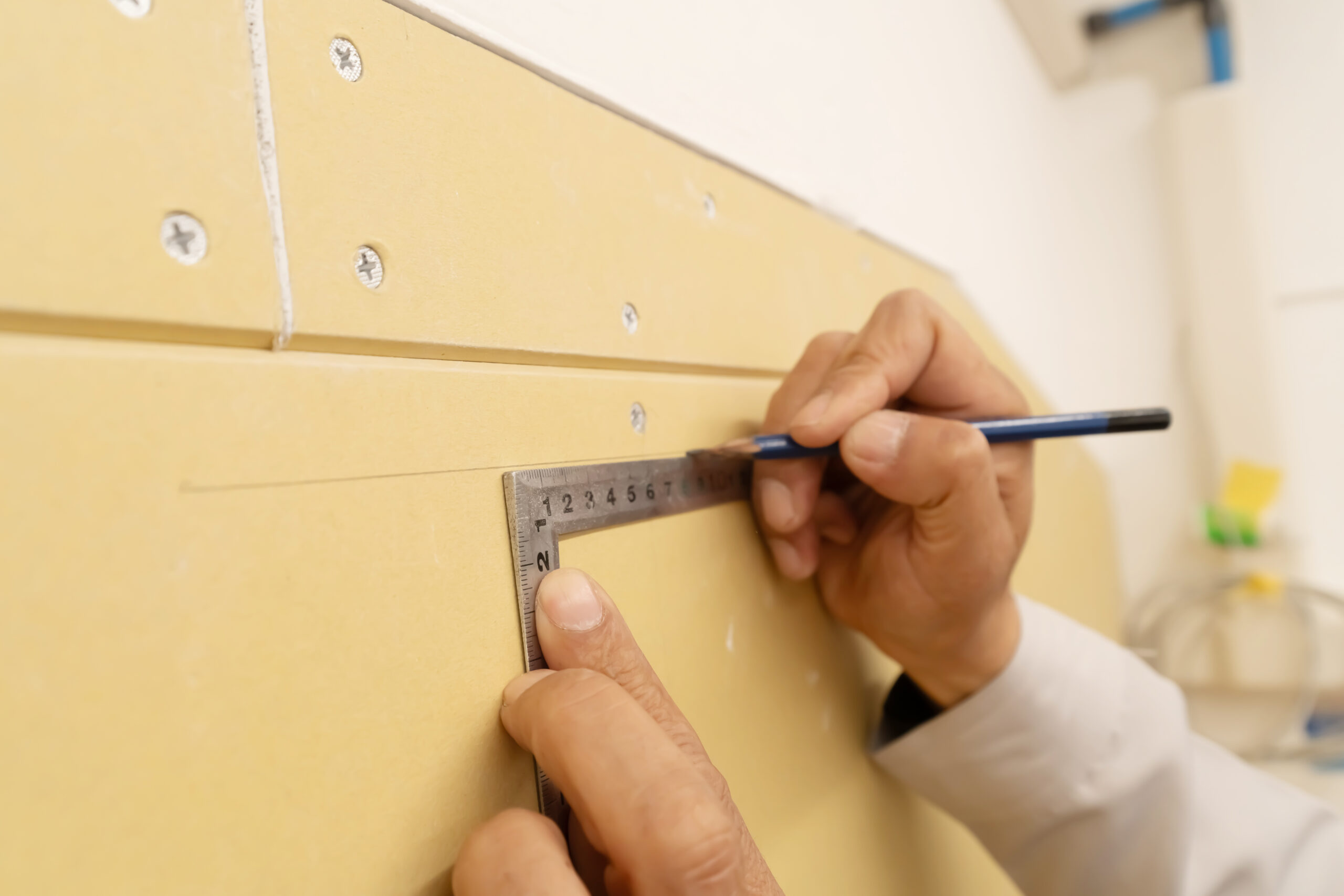 石膏ボードの取り付けでは、ビス間隔や打ち込み深さなど、細部への注意が重要です。ビス間隔は周辺部150mm以下、中間部200mm以下とし、ビス頭は表面から1~2mm沈めて取り付けます。